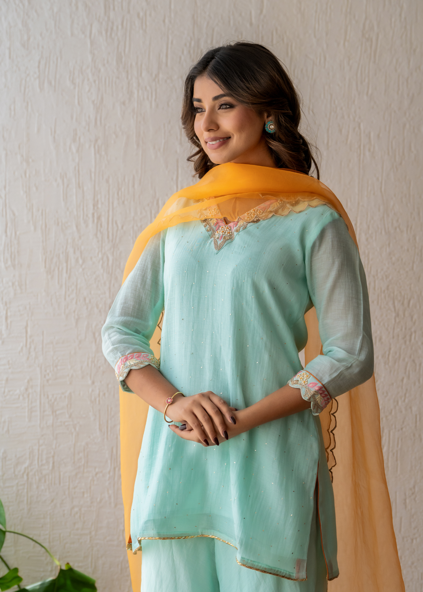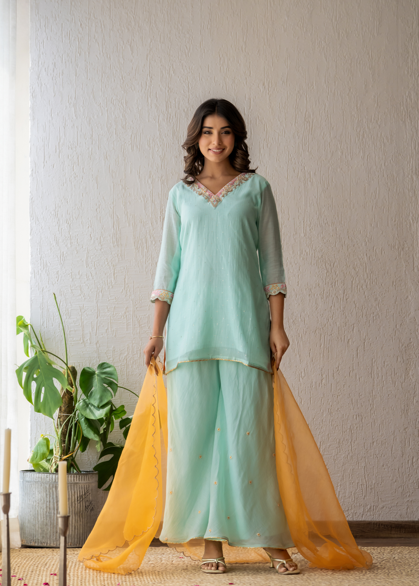The aqua green V-neck, adorned with intricate embroidery of resham and zari, showcases exquisite details on the sharara. Paired with an orange organza scalloped dupatta, it epitomises elegance and sophistication, making it a stunning ensemble for any occasion.
