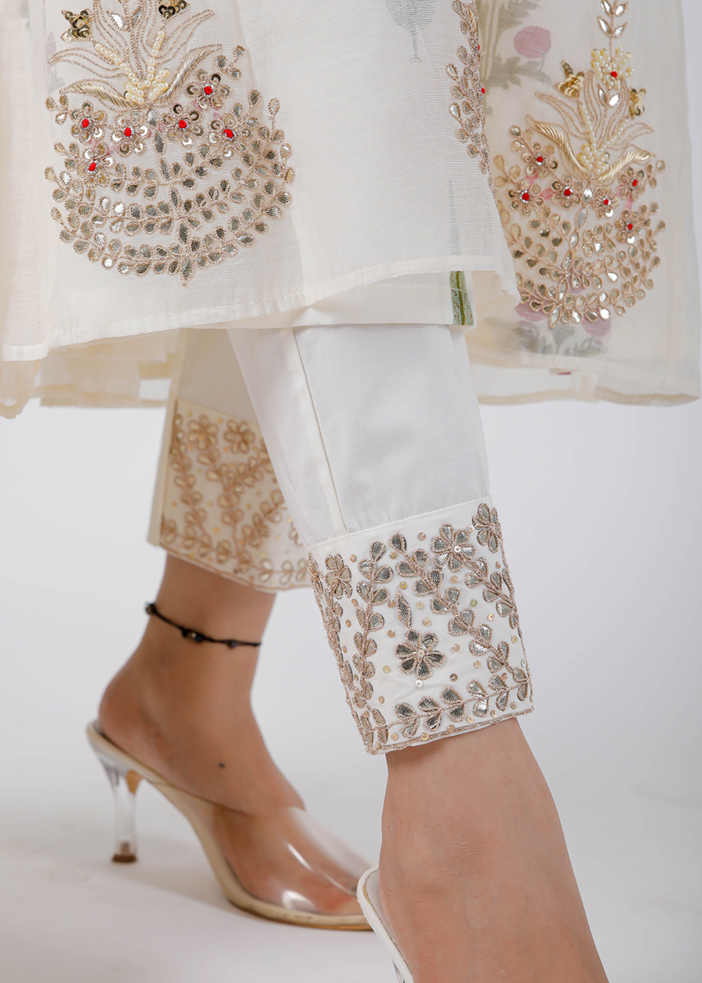 Featuring intricate marodi embroidery on the yoke, adorned with gota motifs on the ghera, paired with gota patti pants and complemented by a block print inner and dupatta.