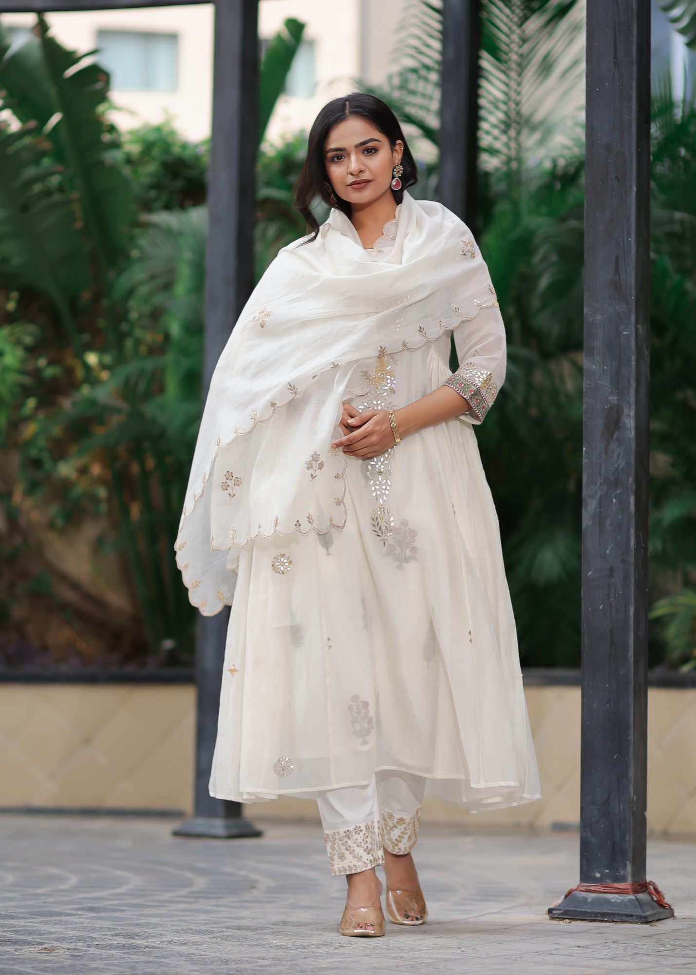A Mughal motif block printed inner accompanies the Chanderi round neck kurta, adorned with a long motif gota patti embroidery on the front and printed inner. Complemented by a scalloped gota patti Chanderi dupatta and cotton pants, creating a royal look.