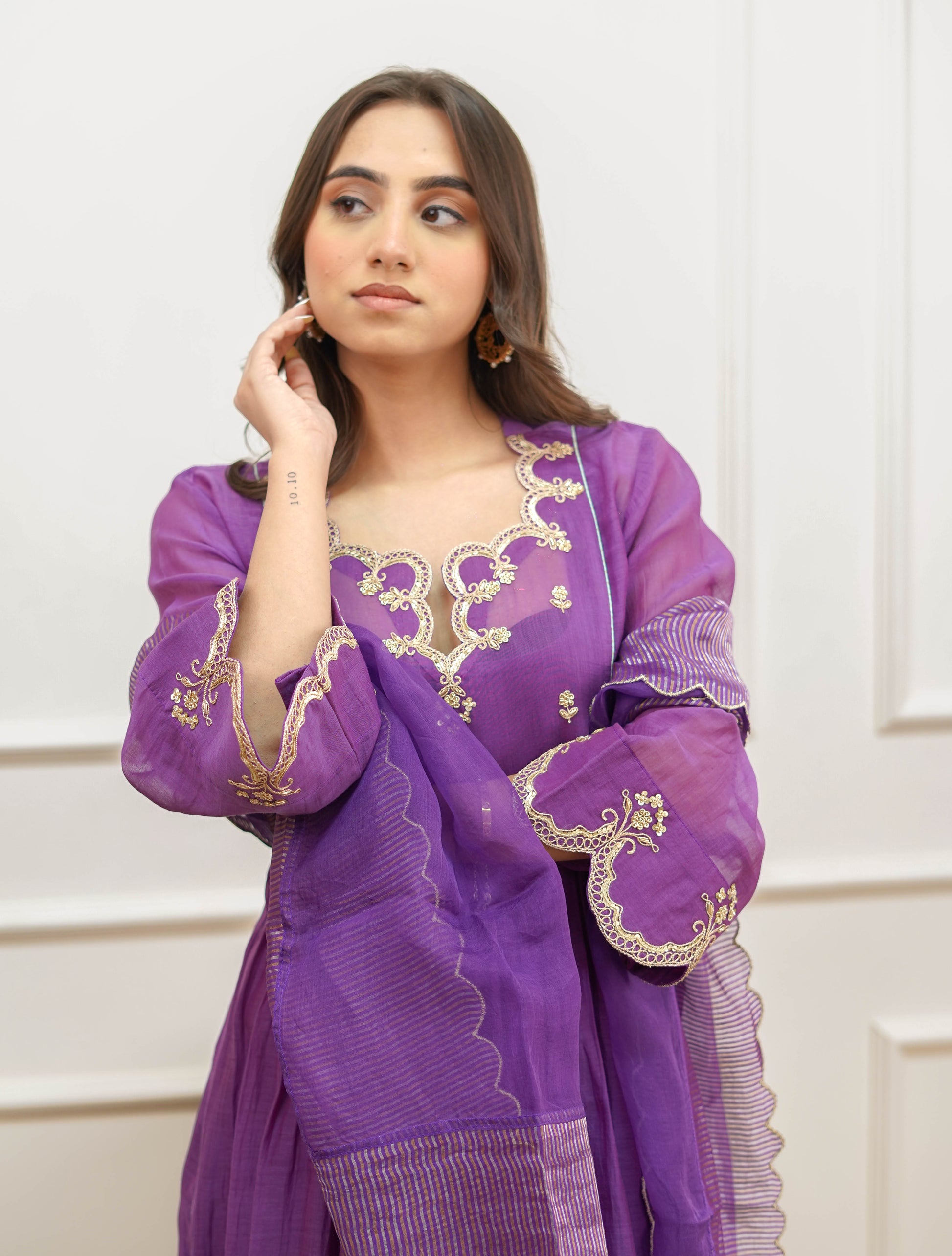 Embrace grace with the Purple Scalloped hand Embroidered Kurta Set from “Rose Jaipur”