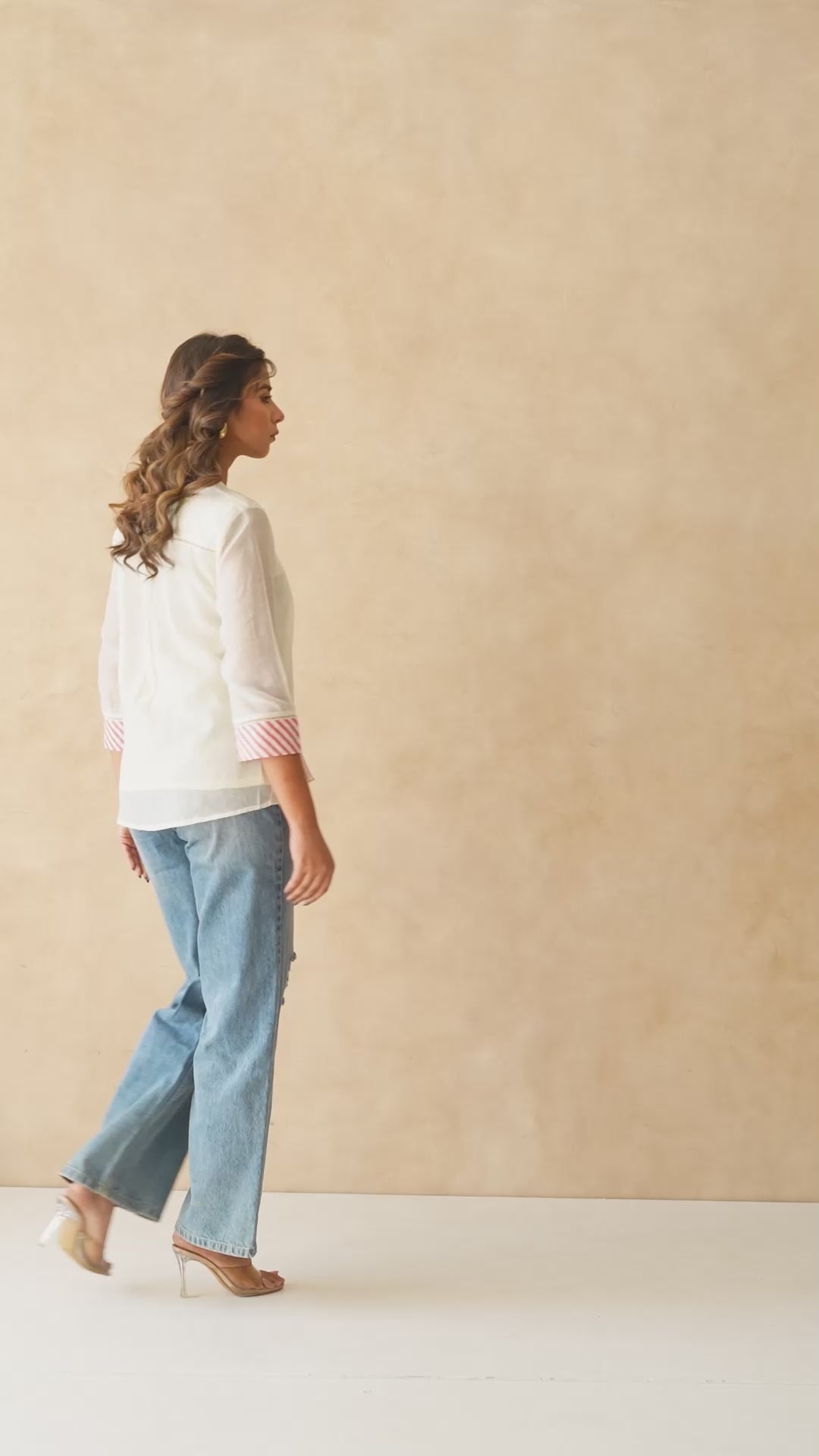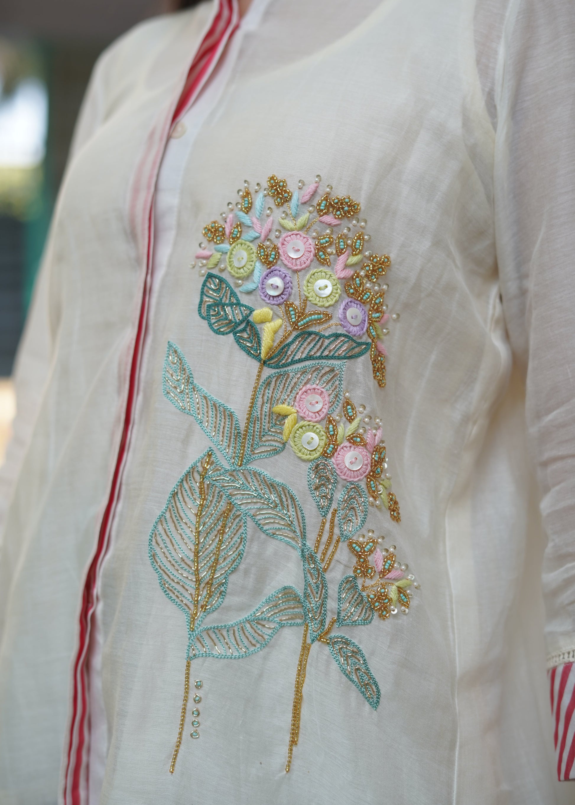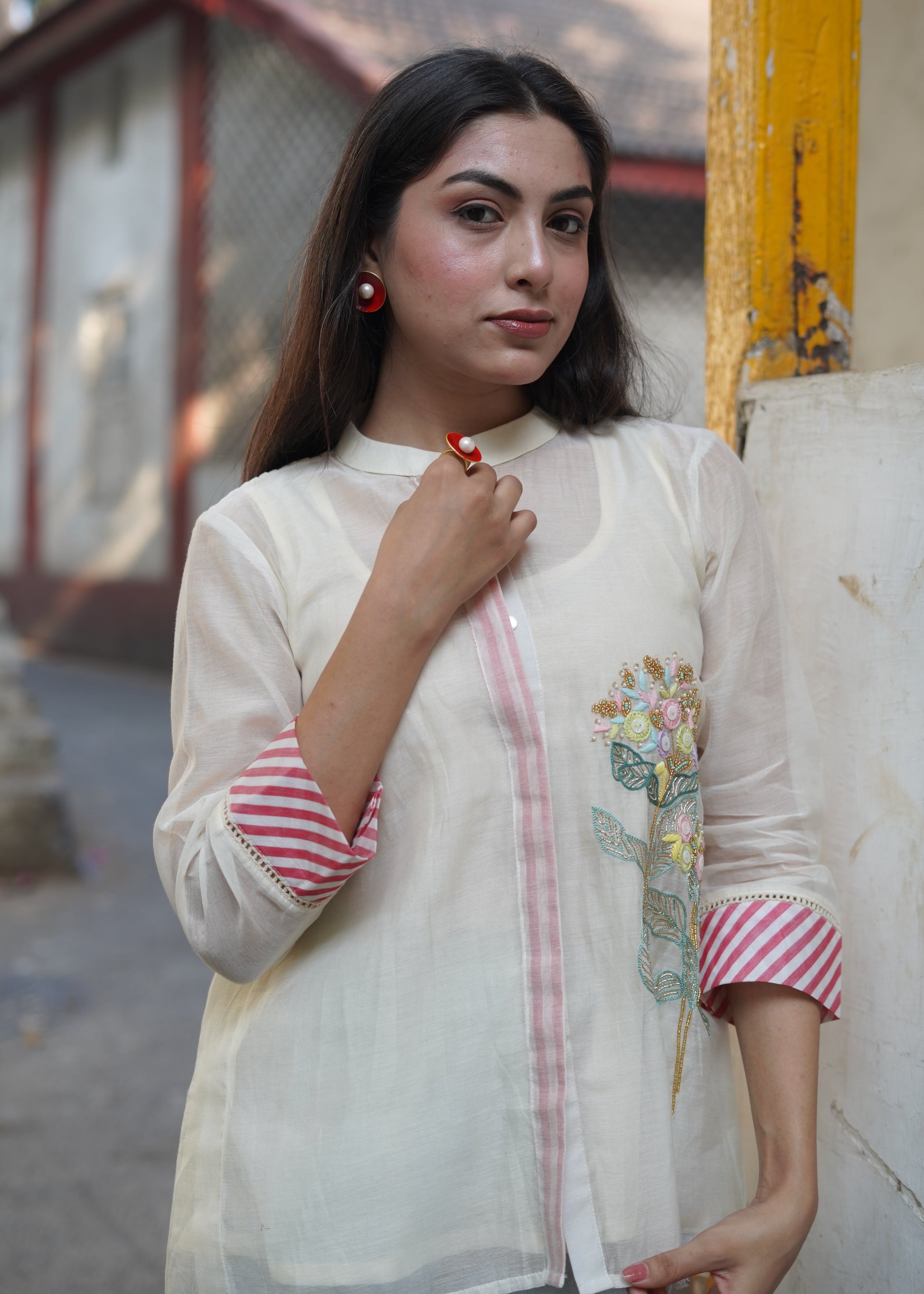 Designed for both style and comfort, this ivory shirt features delicate floral embroidery and subtle pink striped detailing on the placket and cuffs.