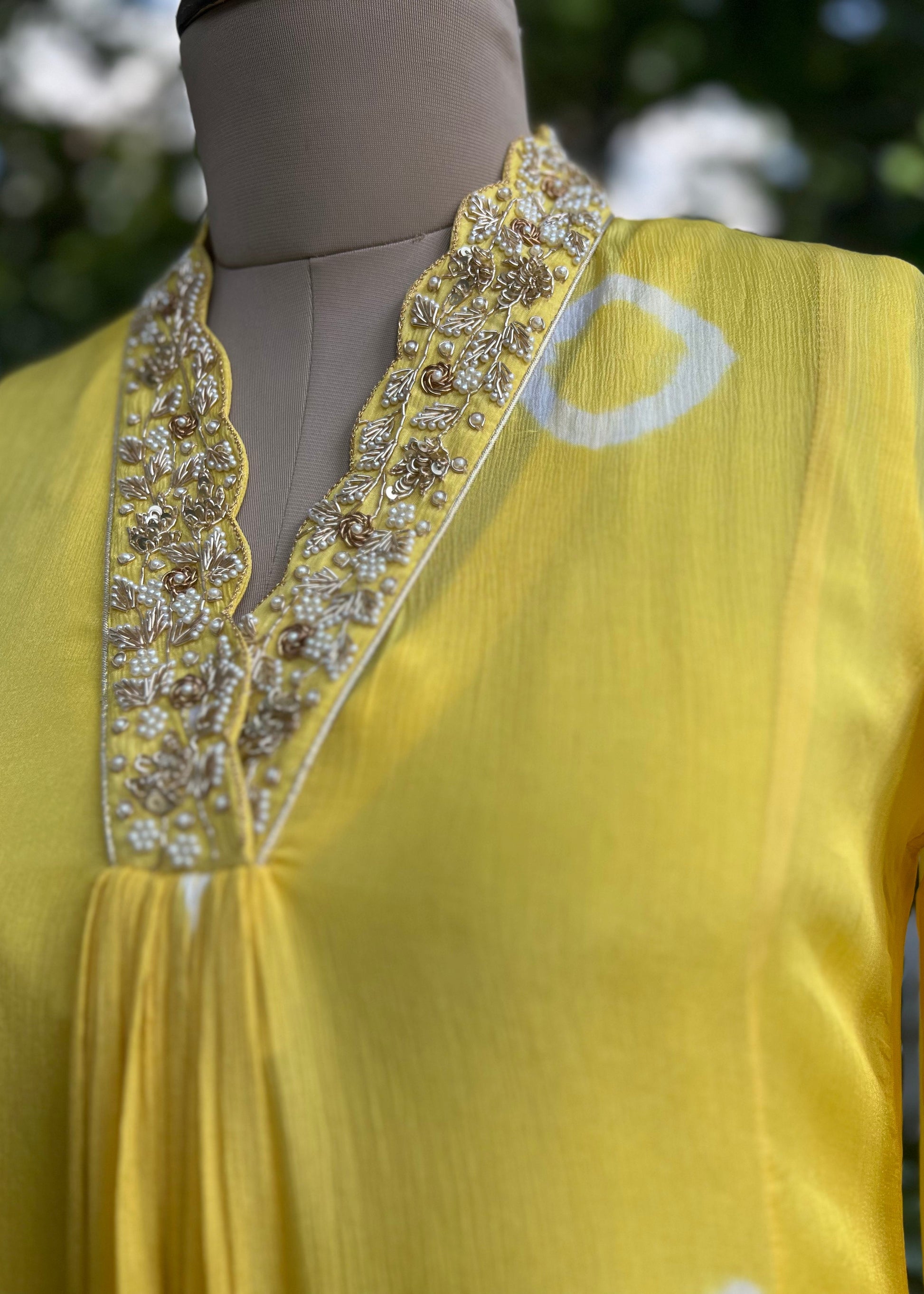 The Yellow Story Kurta Set is crafted with splendid scalloped pearl hand embroidery on a Chinon kurta and is paired with complementing pants. It serves as an extraordinary addition to your wardrobe.